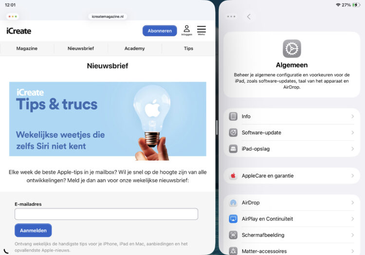 Door een venster hard naar de linker- of rechterzijde van je iPad te ‘werpen’, neemt dit net als vroeger de helft van je scherm in beslag. Heb je twee apps geworpen, eentje naar links en eentje naar rechts, dan zie je zelfs het ouderwetse verdeelstreepje waarmee je de verhoudingen tussen de twee apps bijstelt.