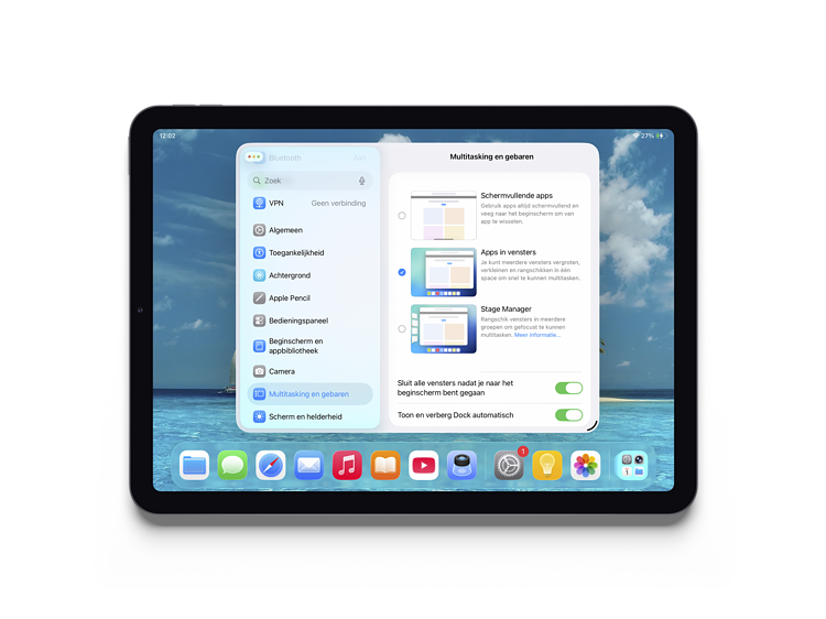 Om met vensters te werken, moet je eerst via ‘Instellingen >Multitasking en gebaren’ de optie ‘Apps in vensters’ hebben ingeschakeld. Je krijgt hier ook opties voor het gedrag van je vensters en je Dock te zien.