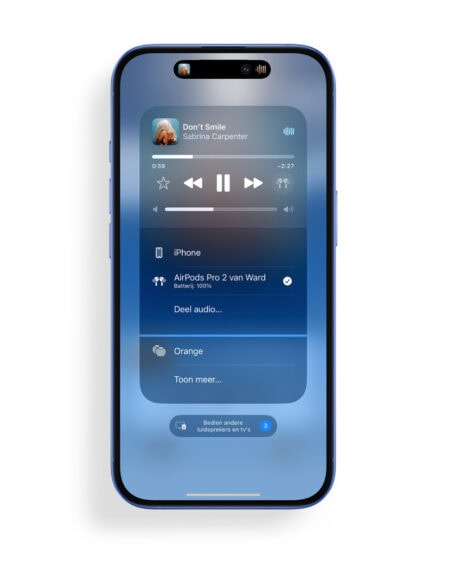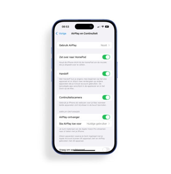Op je iPhone heb je nog twee andere zogenaamde continuïteitsfuncties tot je beschikking naast Handoff: ‘Zet over naar HomePod’ en ‘Continuiteitscamera’. Met Zet over naar HomePod kun je media die je afspeelt op je iPhone gemakkelijk doorsturen naar een HomePod of HomePod mini door hem er gewoon even naast te houden.