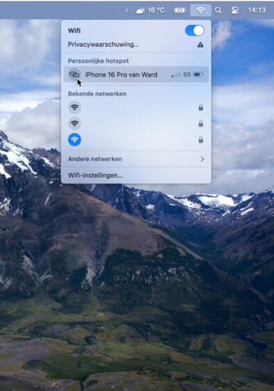 Heeft je Mac even geen internetverbinding, bijvoorbeeld doordat de trein-wifi weer moeilijk doet of omdat er een storing is? Geen probleem: gebruik je iPhone als hotspot! Apple maakt het je gemakkelijk: druk op je Mac op het wifi-symbooltje rechtsboven (of ga naar ‘Systeeminstellingen>Wifi’) en kies hier je iPhone als verbindingspunt.