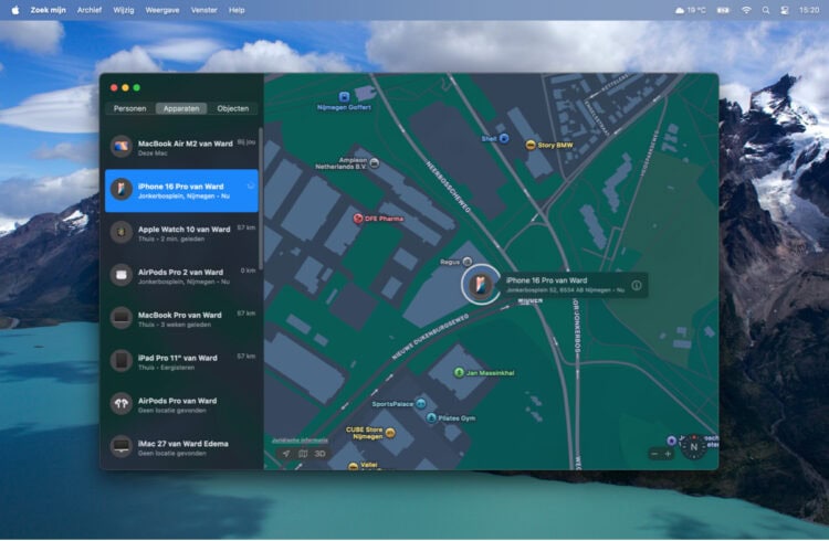 Met de Zoek mijn-app kun je je Mac terugvinden op de kaart vanaf je iPhone, en je iPhone weer terugvinden op de kaart vanaf je Mac. Handig voor als je een van de twee verloren bent, of als het apparaat ergens in huis rondslingert.