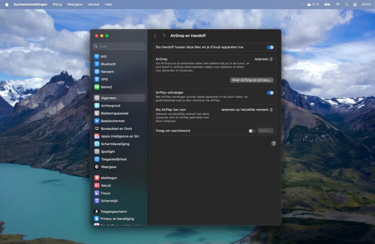 Je schakelt AirDrop in via ‘Systeeminstellingen>Algemeen>AirDrop en Handoff’, of op je iPhone via ‘Instellingen>Algemeen>AirDrop’. Wifi en bluetooth moeten ingeschakeld zijn. Je kiest zelf wie je bestanden mogen sturen: alleen mensen uit je contactenlijst, of iedereen.