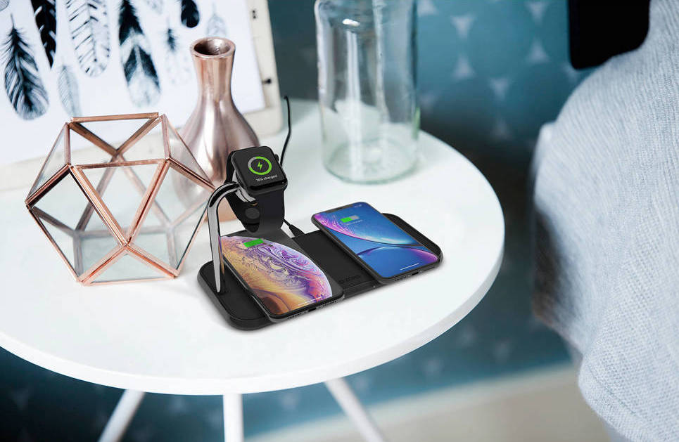 Met deze oplader kun je twee apparaten opladen, bijvoorbeeld je iPhone en draadloos oplaadbare AirPods. Laat je niet van de wijs brengen door het woord ‘dual’, want er is nog ruimte voor een derde apparaat: de Apple Watch heeft zijn eigen plek.
