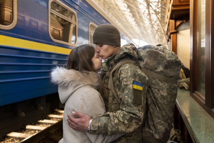 Soldier Volodimir (20, l) kisses his girlfriend Tanya (21) while saying goodbye at the trainstation in Lviv, Ukraine on March 15th 2022. He departs to Kramatorsk, to fight in the war that started after Russia invading Ukraine on the 24th of February 2022. CREDIT: Ilvy Njiokiktjien