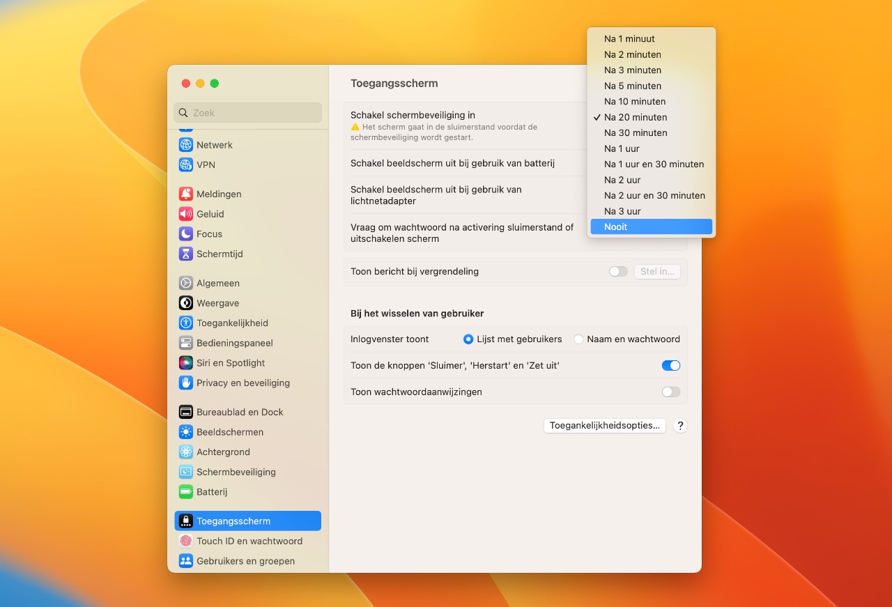 Je computer zonder screensaver gebruiken doe je door Systeeminstellingen te openen en naar Toegangsscherm te gaan. Zet hier de bovenste optie op ‘Nooit’.