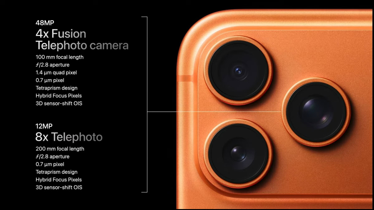 De telelens, ook wel tetraprismalens genoemd, kan ook verder zoomen. In plaats van 5x zit hij nu op 8x. Er zit wel een addertje onder het gras: je kunt volledige 48-megapixel foto’s maken met 4x zoom, en kleinere 12-megapixel foto’s met 8x zoom.