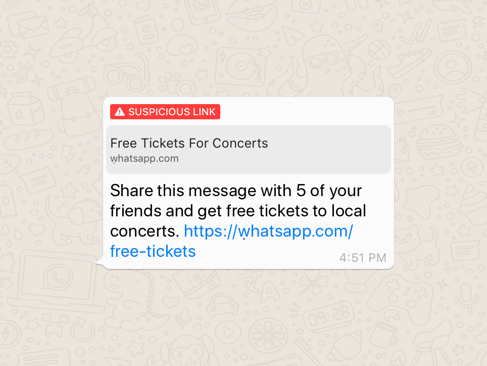 Herinner je je nog dat er onlangs een phishing-bericht rondging op WhatsApp, dat beweerde dat KLM gratis tickets weggaf? Het bijbehorende linkje leek naar de KLM-site te gaan, maar wie goed keek zag dat er een gek teken in stond: onder de k stond een klein puntje. WhatsApp herkent in het vervolg dit soort linkjes, en waarschuwt je dan met een opvallende rode balk en een waarschuwingsbordje. Klik je toch op de link, dan krijg je er nog een melding bovenop: of je de verdachte koppeling wel echt wilt openen. Je bent gewaarschuwd.