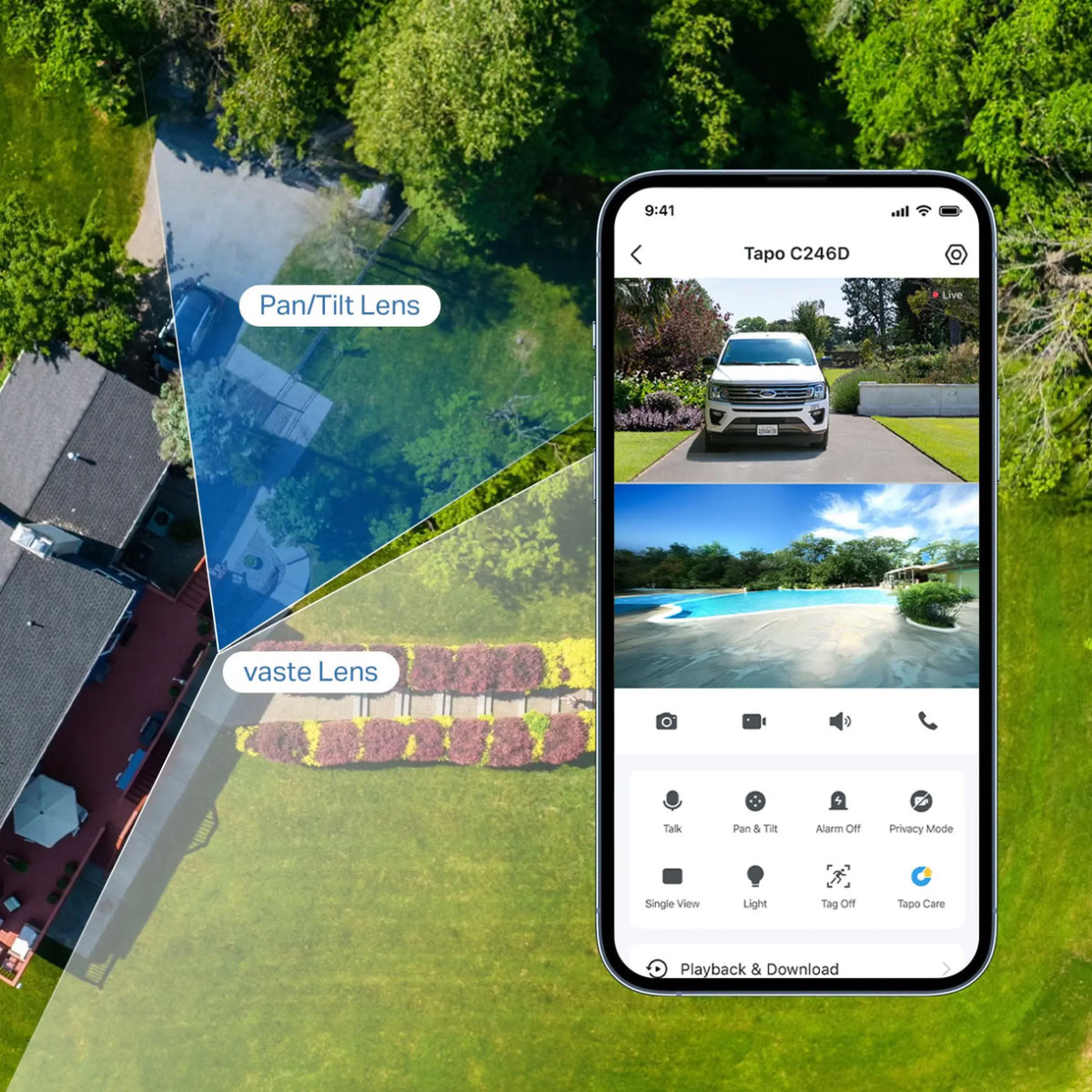 Met zijn dubbele lens en pan- en kantelfunctie is de Tapo C246D beveiligingscamera net zo soepel en flexibel als menig inbreker.
