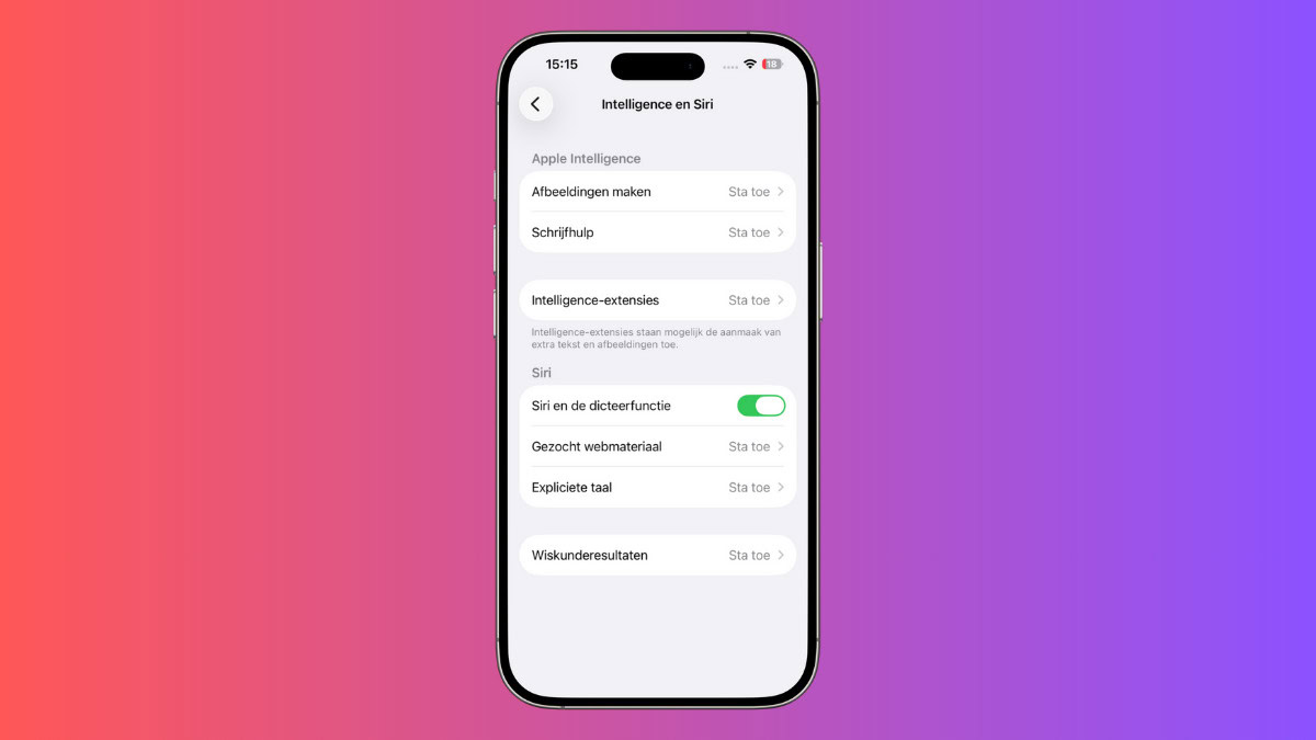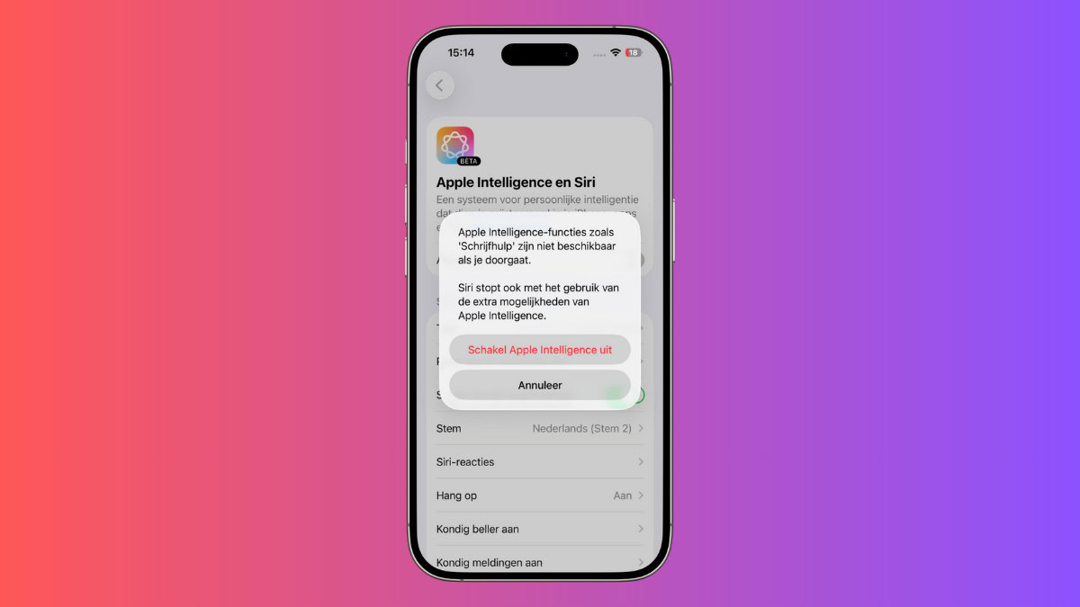 Vanaf dat moment stopt je iPhone met het genereren van AI-suggesties, schrijfhulp, nieuwe Siri-verwerkingsfuncties en beeldhulp. Classic Siri blijft wel gewoon beschikbaar.
